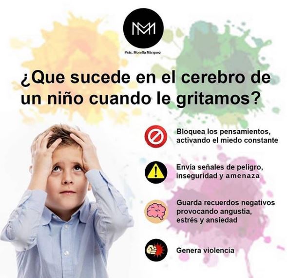 El uso de los gritos son el reflejo de frustración e impotencia, educar sin recurrir al grito es la manera más eficaz de cuidar el mundo emocional de tu hijo. El cerebro ante los gritos, se bloquea e influye de manera negativa afectando el aprendizaje, ya que genera inseguridad, activa el miedo, creando un escudo de protección contra la amenaza que esto representa. Cuando le gritas a tu hijo, lo único que hace es registrar en su cerebro recuerdos desagradables, que a largo plazo, le generarán problemas emocionales, angustia y ansiedad. La violencia verbal de los padres hacia los hijos, ocasiona problemas de conducta y predisposición a la agresividad.