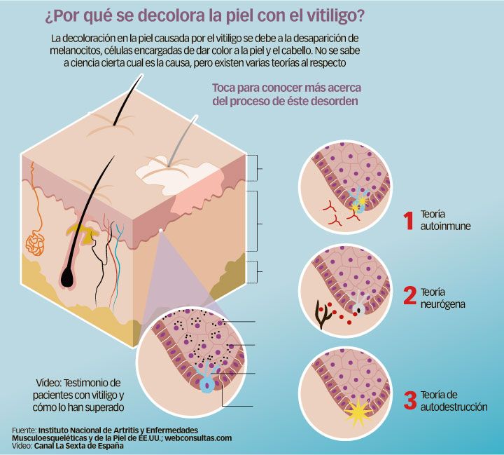 La causa del vitíligo es desconocida. Se sugiere un origen autoinmune en personas con predisposición genética, lo que resultaría en la destrucción de los melanocitos que son las células encargadas de producir melanina y dar el color a la piel.